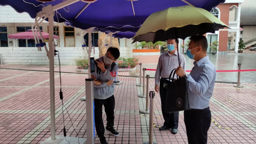 在設(shè)備安裝和數(shù)據(jù)錄入等步驟完成后,我們開始了AI人臉測溫識別終端的展示。11點左右,實驗中學(xué)迎來了教育局領(lǐng)導(dǎo)的蒞臨指導(dǎo),期間AI人臉測溫識別終端也得到了展示機(jī)會。AI人臉測溫識別終端能夠在0.5-1.3m范圍內(nèi)同時進(jìn)行體溫檢測、人臉識別和口罩識別,AI人臉測溫識別終端的表現(xiàn)也得到了教育局和學(xué)校領(lǐng)導(dǎo)的認(rèn)可。