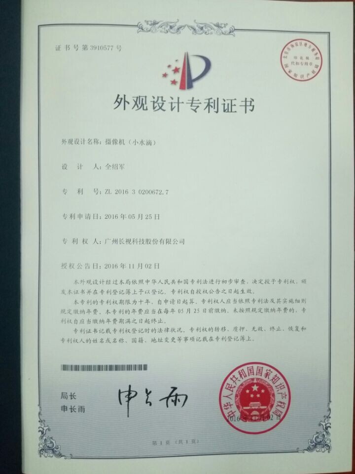2016年12月20日,長視科技榮獲兩個實用新型專利證書和一個外觀設(shè)計專利證書。